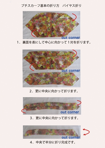 プチスカーフ折り方 バイアス折り 1.裏面を表におきます。中心に向かって1対を折ります。 2.更に中央に向かって折ります。 3.更にもう一度、中央に向かって折ります。 4.中央で半分に折り返して完成です。