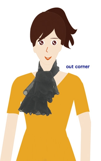 バタフライ(蝶)スカーフです。 結び方は、ピエロ結びです。 ピエロ結びとは、本来スカーフをプリーツ折りにして結んだ後に プリーツをバランス良く広げて「ひらひら感」を出す結び方です。 プリーツ折りとは、端から約5cm程の幅で蛇腹折りにしていく折り方です。 バタフライ スカーフのピエロ結びは、シルエットに特徴が有るからプリーツ折りにしません。 蝶の様なシルエット裁断、縫製しているからです。 それでは、結び方についてです。 首にあてがい、前で一結びします。 全体をバランス良く整えれば、それだけで完成です。