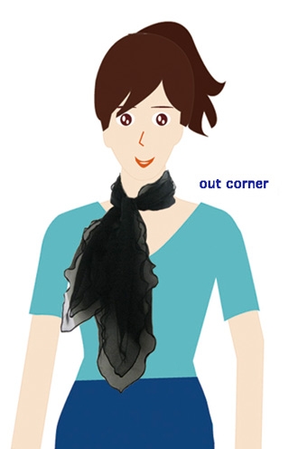 舟の形をしているリトル シップ スカーフです。 シルバーのグリッターが全面にプリントされています。 結び方は、カジュアル クロス結びです。 いたってシンプルに胸元で一度クロスさせるだけです。